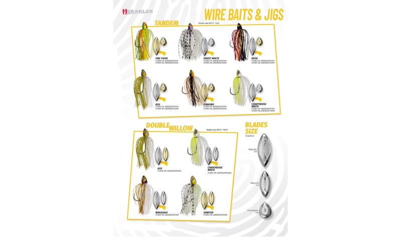 Alcuni colori sono disponibili nella versione tandem (una paletta willow leaf e una Colorado) e altri nella versione double willow (due palette willow leaf) in accordo con l’esperienza del nostro staff. Tutte le palette sono caratterizzate dal design studiato da Herakles con lo speciale engraving che rifrange la luce creando miriadi di piccoli bagliori adescanti.